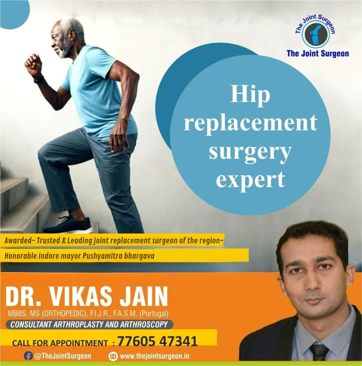 HIP REPLACEMENT SURGEON IN INDORE WHAT IS HIP REPLACEMENT SURGERY? Hip replacement surgery, also known as hip arthroplasty, is a surgical procedure in which a damaged or worn-out hip joint is removed and replaced with an artificial joint (prosthesis) made of metal, ceramic, or plastic. This is usually done to relieve severe pain, stiffness, and loss of mobility caused by conditions like osteoarthritis, rheumatoid arthritis, fractures, or avascular necrosis. The surgeon replaces the ball-and-socket parts of the hip joint: the head of the femur (thigh bone) and the hip socket (acetabulum). Hip replacement helps restore normal movement, reduce or eliminate pain, and significantly improve quality of life when other treatments like medication, physiotherapy, or lifestyle changes no longer work. MAIN CAUSES OF HIP REPLACEMENT 1. Osteoarthritis The most common reason. Caused by age-related wear and tear of the hip joint cartilage.Leads to pain, stiffness, and reduced mobility. 2. Rheumatoid Arthritis An autoimmune disease that causes chronic inflammation of the joints. It Destroys cartilage and bone, leading to severe joint damage and deformity. 3. Hip Fractures This is Especially common in older adults after falls. If the bone can't be repaired properly, hip replacement is often needed. 4. Avascular Necrosis (AVN) It Occurs when the blood supply to the hip bone is reduced, causing the bone to die and collapse. It Can be due to steroid use, alcohol abuse, trauma, or certain medical conditions. 5. Childhood Hip Diseases (e.g., Developmental Dysplasia, Perthes' disease) Improper hip development can cause long-term joint problems. These conditions may eventually lead to early joint damage and arthritis, requiring replacement in adulthood. TYPES OF HIP REPLACEMENT SURGERY 1. Total Hip Replacement (THR) – Most Common Both the ball (femoral head) and the socket (acetabulum) are replaced with artificial components. 2. Partial Hip Replacement (Hemiarthroplasty) In this surgery Only the femoral head (ball) is replaced and the socket is left as it is. 3. Hip Resurfacing In this surgery The femoral head is not removed, but instead it is reshaped and capped with a metal cover. The socket may still be replaced. 4. Revision Hip Replacement A repeat surgery is done when a previous hip replacement has failed or worn out. This is More complex and may involve replacing only part or maybe all components. It is Needed due to implant loosening, infection, fracture, or wear. WHO NEEDS HIP REPLACEMENT Hip replacement surgery is recommended for people who have severe hip joint damage that causes chronic pain, stiffness, and difficulty in movement, and does not improve with medicines. Who needs it : 1.People with Advanced Osteoarthritis 2.Patients with Rheumatoid Arthritis 3.Individuals with Avascular Necrosis (AVN) 4.People with Hip Fractures (Especially Elderly) 5.Those with Childhood Hip Disorders. Common signs that you may need hip replacement surgery : 1.Constant hip pain, even while resting 2.Stiffness and limited range of motion 3.Limping or difficulty standing/walking 4.No improvement with physiotherapy, medication, or injections. HOW IS HIP REPLACEMENT DONE? Hip replacement surgery is a procedure where a damaged hip joint is replaced with an artificial implant to relieve pain and restore movement. It usually takes 1.5 to 2 hours and is done under spinal or general anesthesia. How is it done? 1.Anesthesia The patient is given spinal anesthesia (numbs the body below the waist) or general anesthesia (makes you sleep during surgery). Sometimes a combination is used. 2. Incision A cut is made over the side, front, or back of the hip, depending on the approach used. Traditional approach: larger incision (20–30 cm) Minimally invasive: smaller incision (8–15 cm) 3. Removing the Damaged Bone The femoral head (ball part of the hip joint) is removed. The damaged cartilage and bone from the socket (acetabulum) are also cleaned out. 4. Inserting the Artificial Implants A metal or ceramic cup is placed into the hip socket. A metal stem is inserted into the thigh bone (femur), and a ball (metal or ceramic) is attached to the top. These parts together form the new artificial hip joint. 5. Fixing the Implants Implants may be cemented into place (common in older adults) or left uncemented, allowing bone to grow onto them Sometimes a combination of both methods is used. 6. Closing the Incision Muscles and tissues are repaired, and the skin is stitched or stapled. For more details on total hip replacement/ DAA total hip replacement, please visit our dedicated website for hip joint issues created by Dr Vikas jain- www.hipreplacementindia.in https://hipreplacementindia.in/treatment/bikini-hip-replacement/