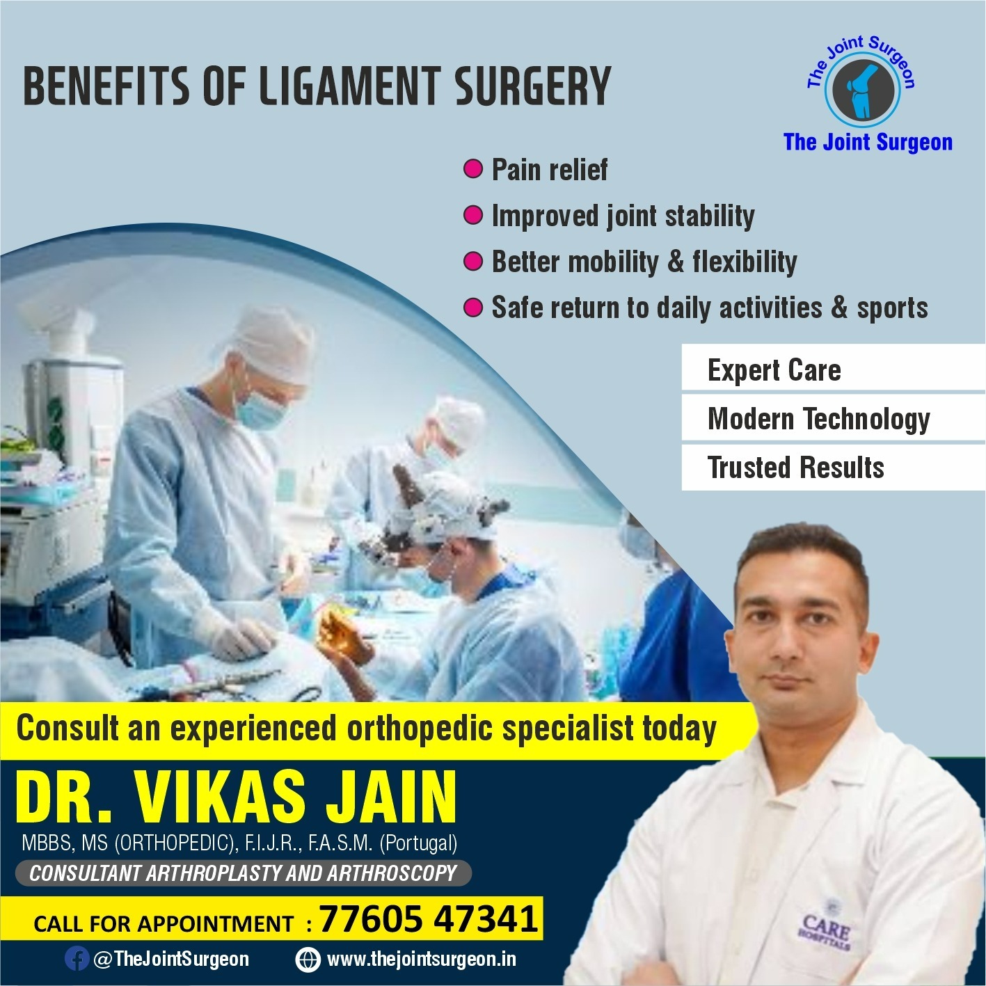 With comprehensive pre-operative planning and post-surgical rehabilitation guidance, he helps patients return to normal activities and sports safely. If you are searching for the best ligament surgery specialist in Indore, Dr. Vikas Jain provides expert orthopedic care and personalized treatment solutions for long-term joint health.