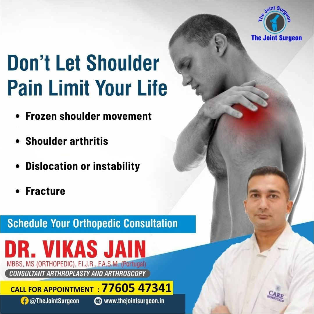 Looking for the best doctor for shoulder pain treatment in Indore? Dr. Vikas Jain is a trusted orthopedic specialist known for accurate diagnosis and effective treatment of shoulder conditions. He treats problems such as frozen shoulder, rotator cuff injury, shoulder arthritis, ligament tears, and sports-related shoulder pain using advanced, evidence-based techniques. Dr. Vikas Jain best orthopedic doctor in Indore focuses on non-surgical treatments whenever possible, including medication, physiotherapy guidance, and lifestyle modification, while offering surgical options when required. With a patient-centric approach, he creates personalized treatment plans to reduce pain, restore movement, and improve strength. Patients appreciate his clear consultation, compassionate care, and long-term relief results. Visit Dr. Vikas Jain in Indore for expert shoulder pain treatment and regain comfortable, pain-free shoulder movement.