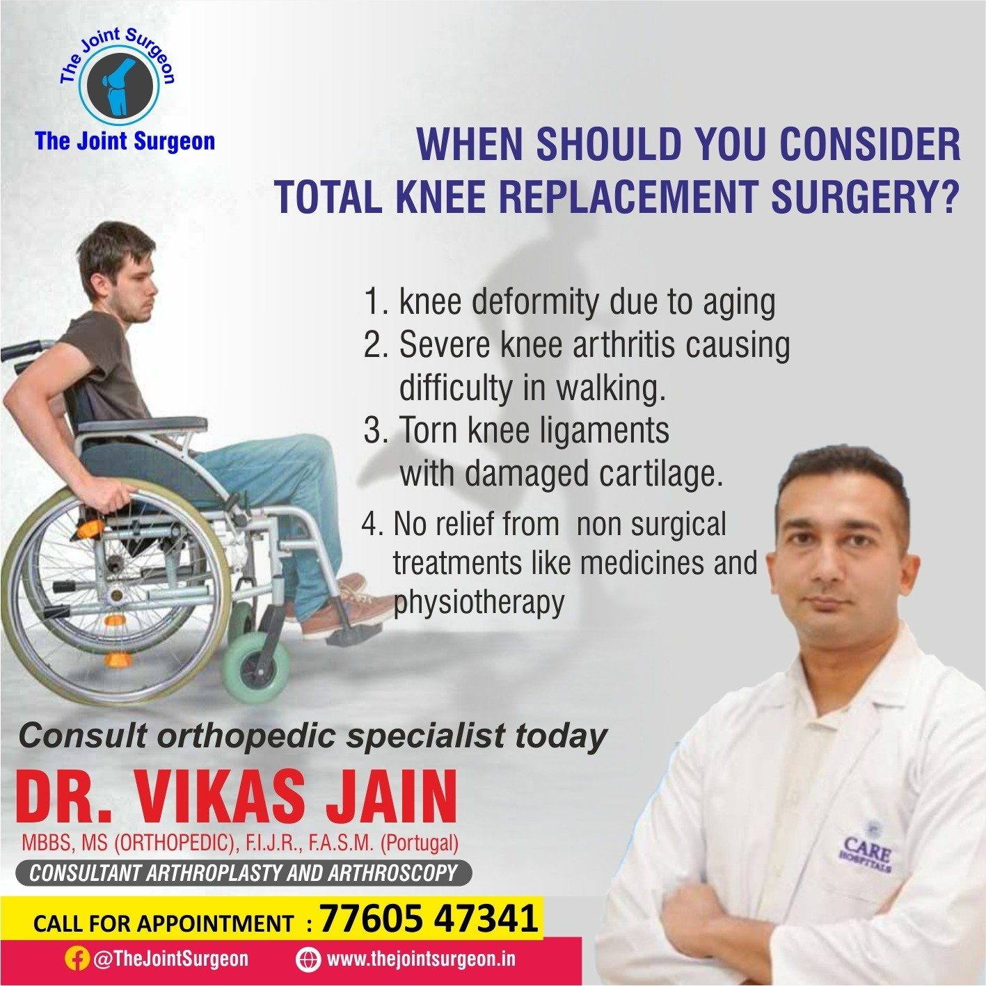 You should consider Total Knee Replacement surgery when knee pain becomes constant, limits daily activities, affects sleep, or does not respond to medications, physiotherapy, or injections. The surgery helps relieve long-term pain, correct knee deformities, improve walking ability, and allow patients to return to an active lifestyle.